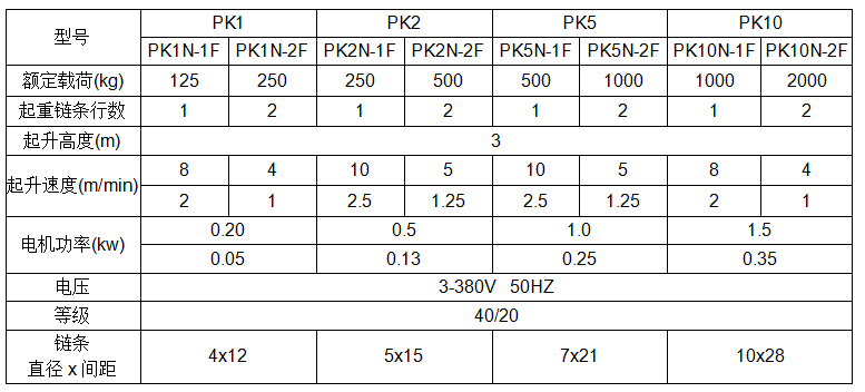 冠航PK型電動葫蘆起重量為125kg-2000kg,單速和雙速。PK型電動葫蘆主要采用高強度輕金屬合金制造,具有結構緊湊、體積小、重量輕的優點。PK型電動鏈式提升機的錐形轉子電機根據自制動原理,具有常速、快速和精升速等多種形式。在正齒輪減速器中,第二傳動齒輪配有摩擦安全聯軸器,使電動葫蘆不承受極端過載,高強度、高耐磨的鋼鏈能夠平穩、安全地提升。因此,它是非常安全可靠的。